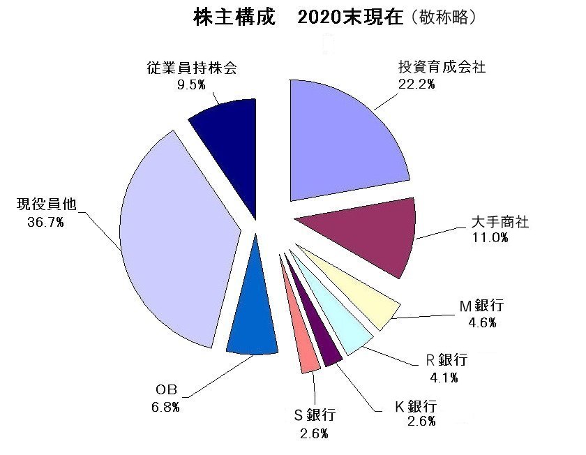| 現在の株主は、投資育成会社・銀行・商社・OB・現役員・社員持株会など23名で構成され同族株主は存在しません。 |